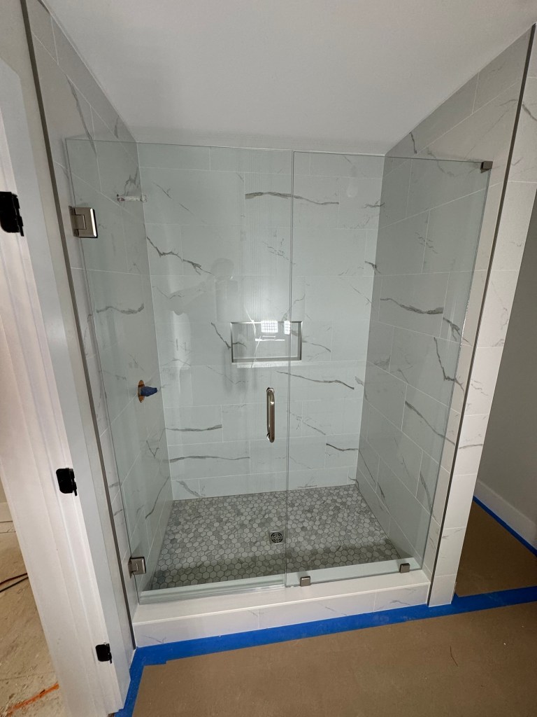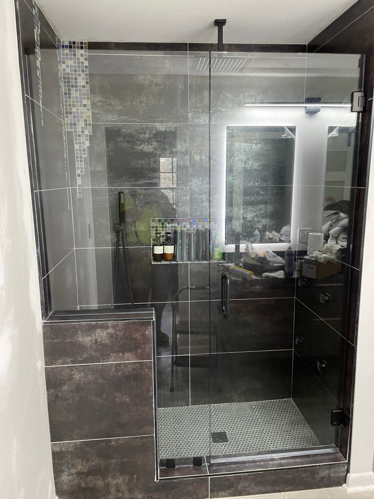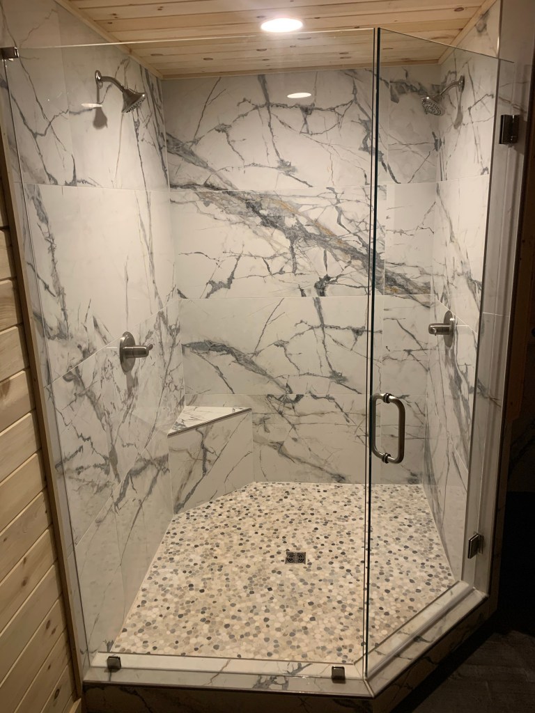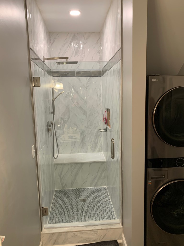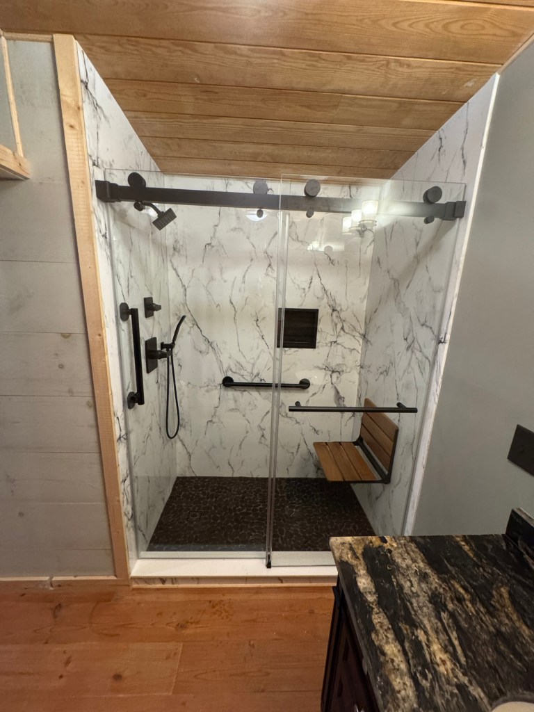 Completed Projects Acrylic walls with a custom tile pan and tiled drain grate. With bench, grab bars, niche, and barn door style glass doors. Share this: Click to share on X (Opens in new window) X Click to share on Facebook (Opens in new window) Facebook Like Loading...